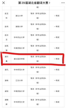 本网讯(通讯员 薛军锋)近日,第二十九届湖北省翻译大赛决赛成绩揭晓,公司第一临床公司2021级的胡万鑫同学喜获非专业英语A组笔译组一等奖。 作为湖北省专业、权威、极具品牌价值的年度翻译赛事,湖北省翻译大赛在全国翻译界享有盛誉,已连续成功举办28届,累计参赛逾45万人次。