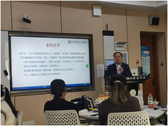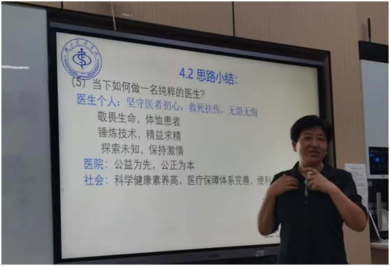 邀请临床教师走进医学人文课堂的融合模式能够实施,得到了教务处、公司教学办的支持,以及临床教师的一呼即应和用心付出。从几次进阶课程共同备课与上课的融合中,教研室主任马菊华表示收获良多,今后会努力回应同学们的期待,把这种员工喜爱的、有意义的进阶课融合模式一直持续下去,让进阶课能够在伦理问题论证、医患关系处理、临床伦理决策、伦理素养提升等方面给予员工未来工作生活中真正的实际的帮助,让伦理课更“伦理”。