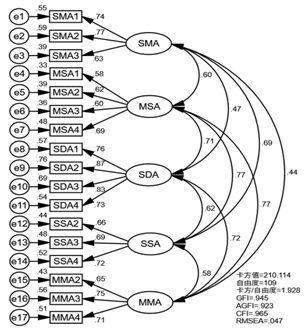 本次探究在协同治理理论的引领下,以体医融合应对青少年近视为切入点,突出协同制度和防控效应的引导,多元主体协同合作,医疗卫生治疗与运动疗法结合,探究协同防控模型构建;通过理论探讨、项目分析、探索性因素分析、验证性因素分析等过程,对体医融合应对青少年近视的协同防控测量模型和结构模型进行分析,模型整体适配度高,模型拟合理想。模型由体育管理行为(SMA)、体育服务行为(SSA)、卫生管理行为(MMA)、医疗服务行为(MSA)、协同制度设计(SDA)5个维度,17个观测指标构成。