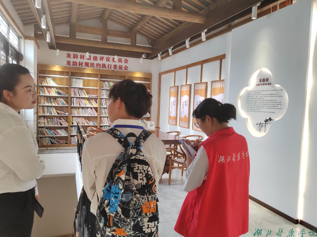 实践队队员们前期已经与龙韵村村委取得联系,说明调研学习意向,得到了村委的大力支持。12日上午,龙韵村工作人员带领实践队员们参观了村史馆、并走访了当地农户,通过走访了解到龙韵村是湖北省第一批精准扶贫、脱贫攻坚的项目,是省级乡村振兴示范基地,村中居民多为扶贫拆迁移居而来,迁居生活改善还需大家共同努力,如原以农业为生的村民们只有少量耕地,且当地旅游业发展为村民们的就业带来的便利有限,村民们并不富足,就业等问题仍待解决。随后,实践队成员以相同形式相继对金矿村和黄坪村进行调研学习。