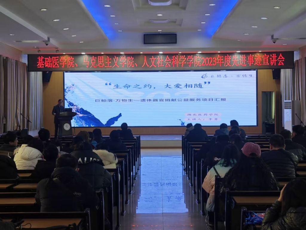 本次宣讲会邀请到2023年“荆楚楷模”、“十堰好人”、基础医公司形态学实验室副主任、巨鲸落·万物生遗体器官捐献志愿服务队队长李勇老师和2023年湖北省一流本科课程《病理生理学》负责人张亚辉老师进行分享交流。