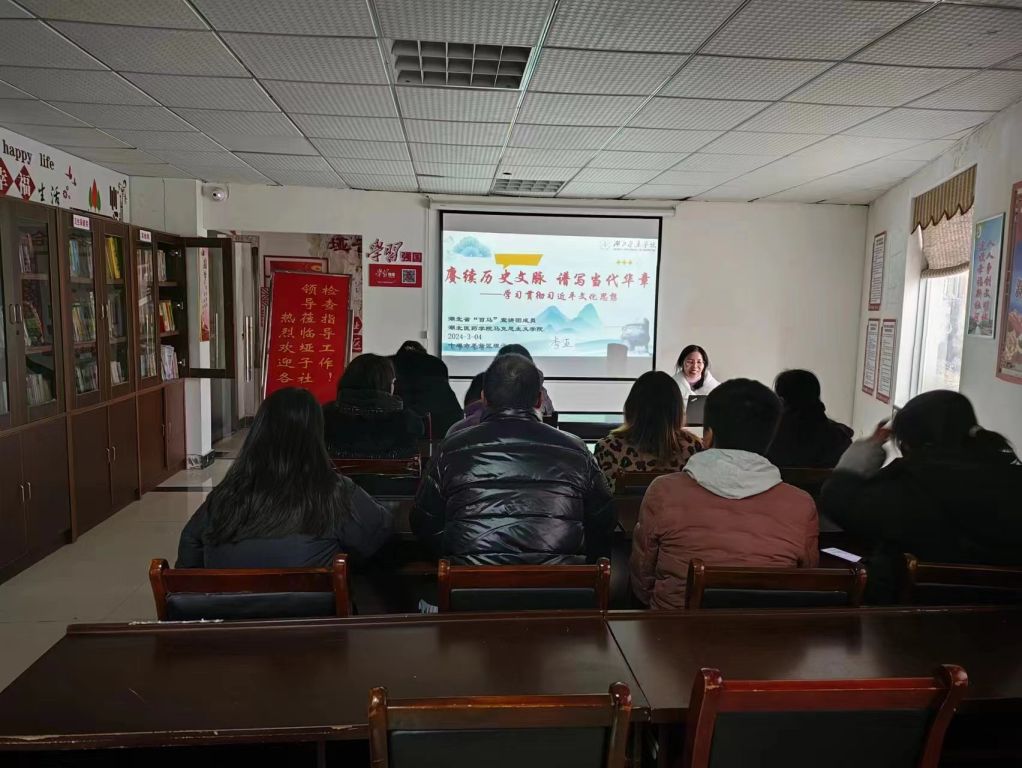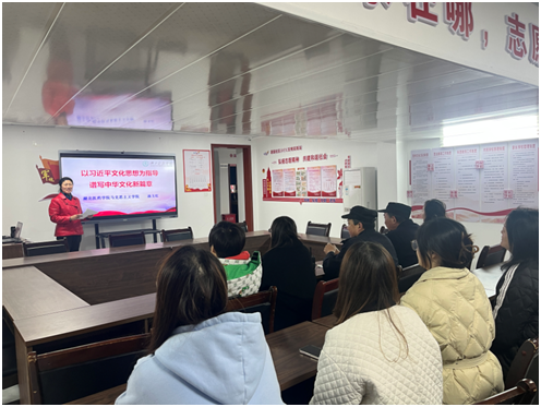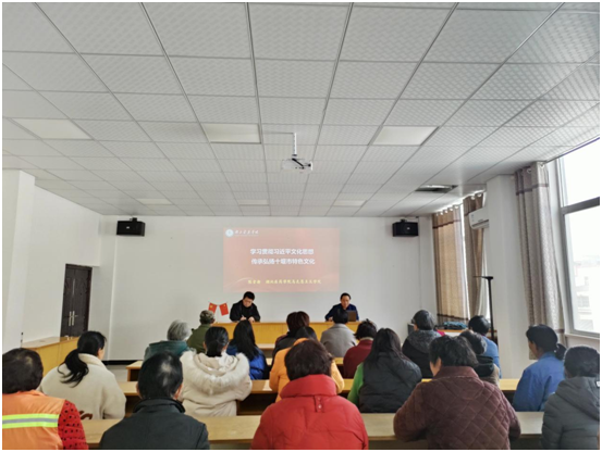 2024年3月7日下午,马克思主义副经理、教授陈全新受邀到十堰市茅箭区二堰街道百二河村宣讲习近平文化思想,宣讲的题目为《学习贯彻习近平文化思想传承弘扬十堰市特色文化》,主要内容包括为什么建设中国特色社会主义文化、为什么要坚持马克思主义在意识形态领域指导地位的根本制度、为什么要用社会主义核心价值观凝心聚力、如何提升国家文化软实力和中华文化影响力、传承弘扬十堰市特色文化等,十堰市特色文化包括武当道教文化、汽车文化、汉水文化、移民文化、诗经文化、医药文化、恐龙文化、皇家文化等。百二河村干部群众20余人听取了讲座。