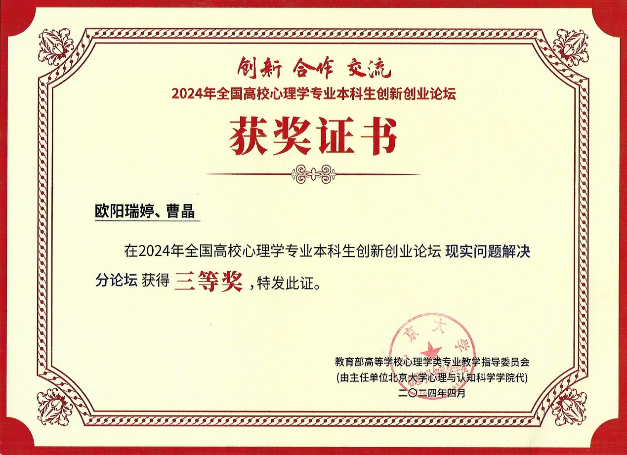 本网讯(通讯员 李培培)由教育部高等公司心理学类专业教学指导委员会主办的2024年全国高校心理学专业本科生创新创业论坛于2024年2月至4月举行,论坛涵盖心理实验设计、现实问题解决、心理学产品设计、心理科普短视频四个分论坛。马克思主义公司应用心理学系本科生欧阳瑞婷、曹晶两名同学获得现实问题解决分论坛三等奖。