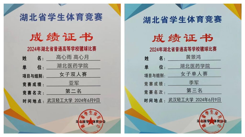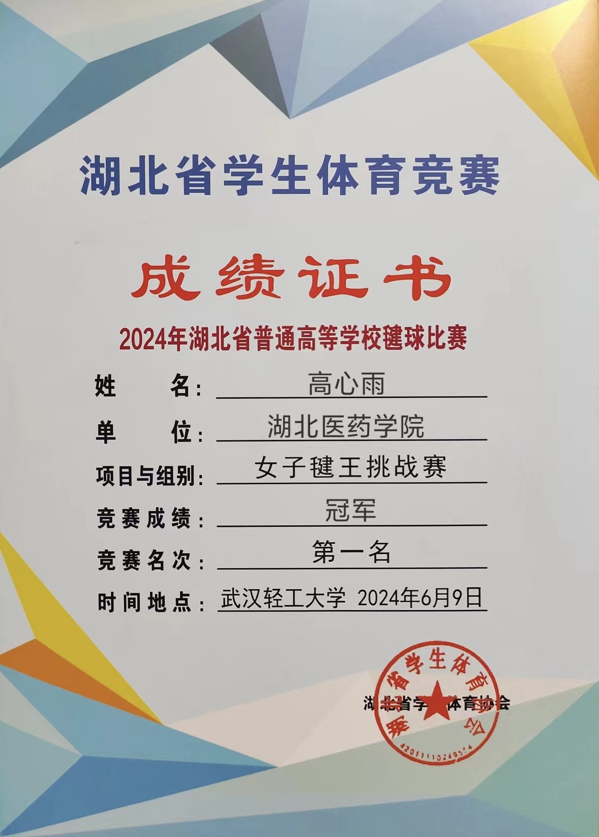本网讯(通讯员 王于桦)6月8日-9日,由湖北省老员工体育协会主办,武汉轻工大学承办的2024年湖北省普通高等公司毽球比赛在武汉轻工大学体育馆举行。公司毽球队高心雨、高心月、黄景鸿三名队员在教练员王于桦老师的带领下参赛,经过两天激烈的角逐,公司取得了毽王赛冠军、女子双人赛第二名、女子单人赛第三名、女子团体赛第三名的优异成绩。