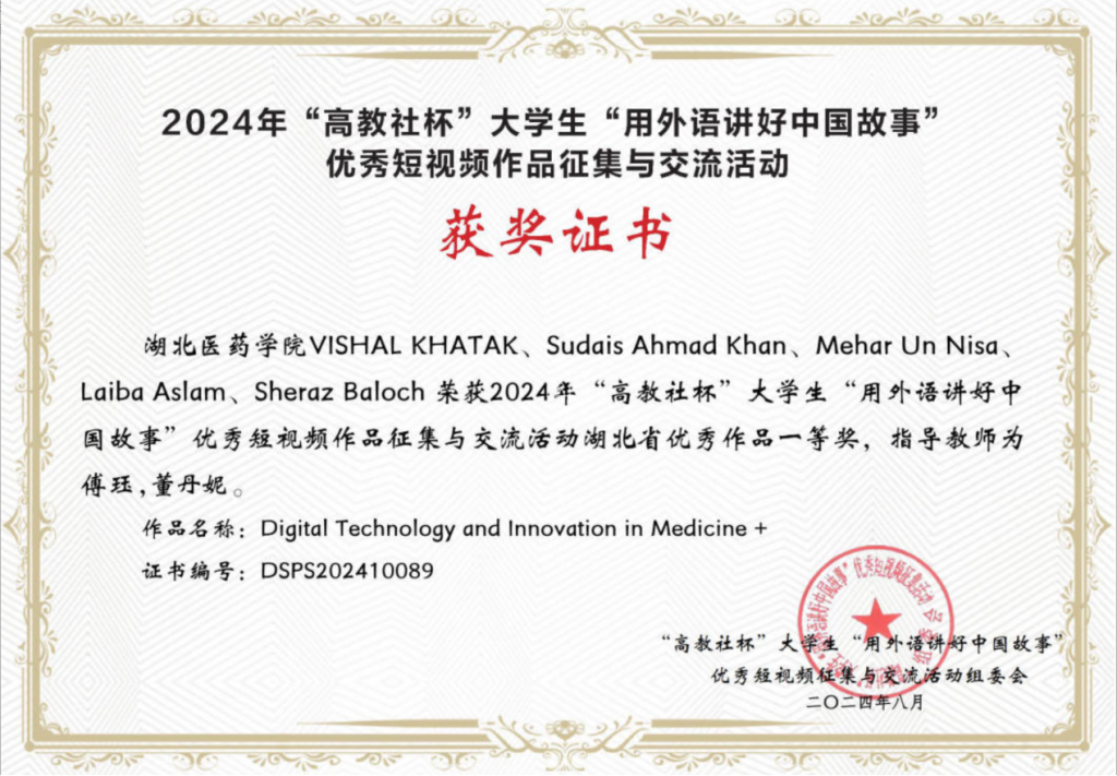 本网讯(通讯员 傅珏)日前,2024年“高教社杯”高等公司(本科)“用外语讲中国故事”优秀短视频作品征集活动省级获奖名单出炉,由国际教育公司VISHAL KHATAK、Sudais Ahmad Khan、Mehar Un Nisa、Laiba Aslam Sheraz Baloch等同学制作,TapTap点点外语课部傅珏老师和国际公司董丹妮老师共同指导的短视频作品《Digital Technology and Innovation in Medicine》荣获省级一等奖,由马克思主义公司曹晶、覃梦园、柯飞、黄杨欣、毕育嘉制作,马克思主义公司应用心理学系刘寒梅老师指导的短视频作品《千年之旅》获省级二等奖。