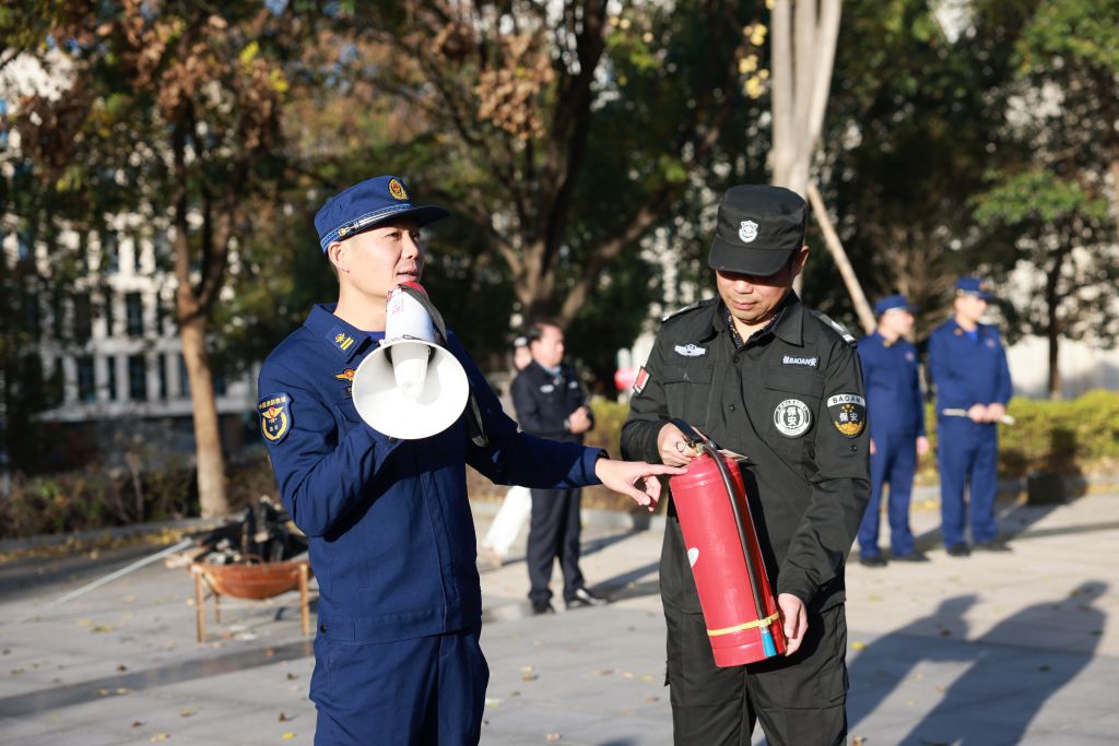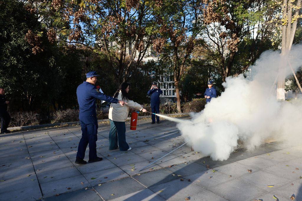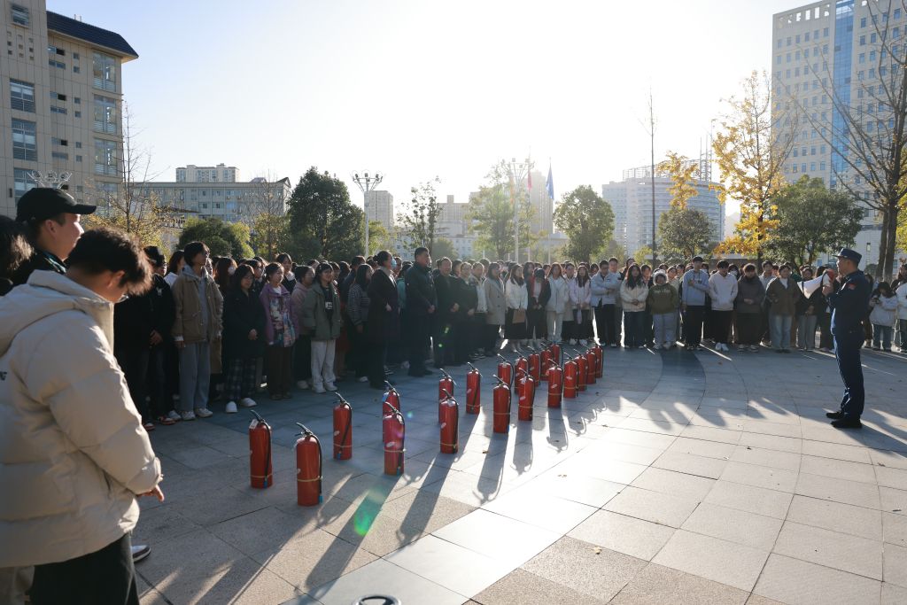 在文明广场前,校保卫处特邀茅箭区消防救援大队吉祥站站长孙中本开展消防安全基本知识讲座,孙站长耐心细致为现场师生讲解灭火器使用及灭火实操。